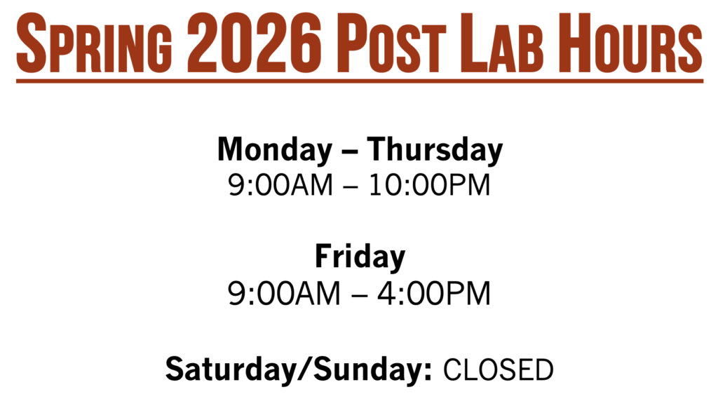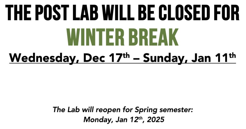 Software lists for the Post Lab and associated spaces can be found below. This document is updated at the beginning of each semester.